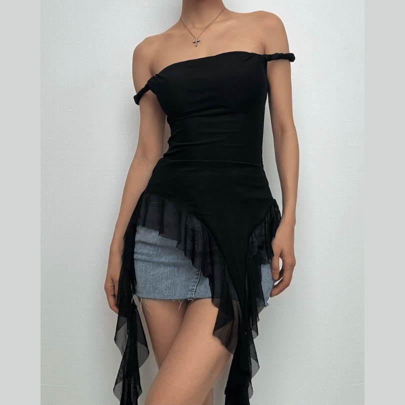 Off shoulder ruffle irregular mesh top | Festival Outfits Women