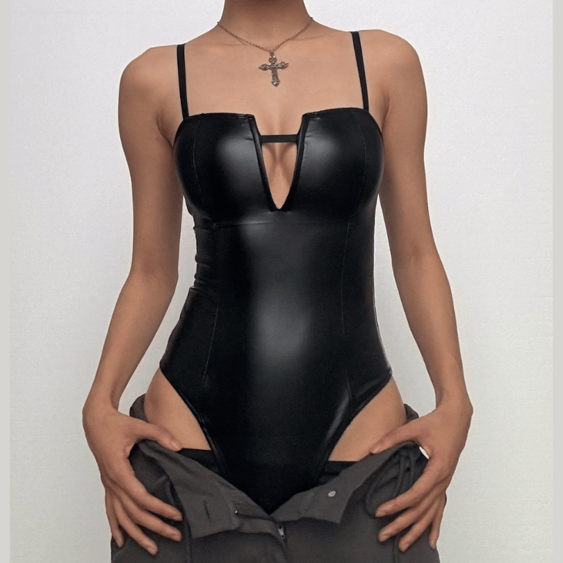 Notch neck solid backless PU leather cami bodysuit | Festival Outfits Women