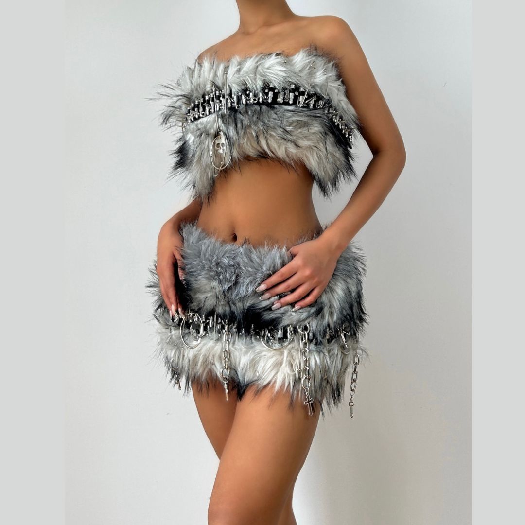Fluffy metal chain tube mini skirt set | Festival Outfits Women