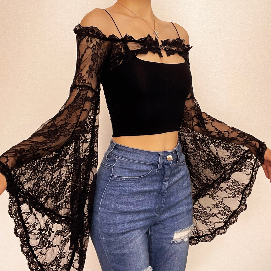 Solid flared sleeve lace hem button hollow out shrug cut out top