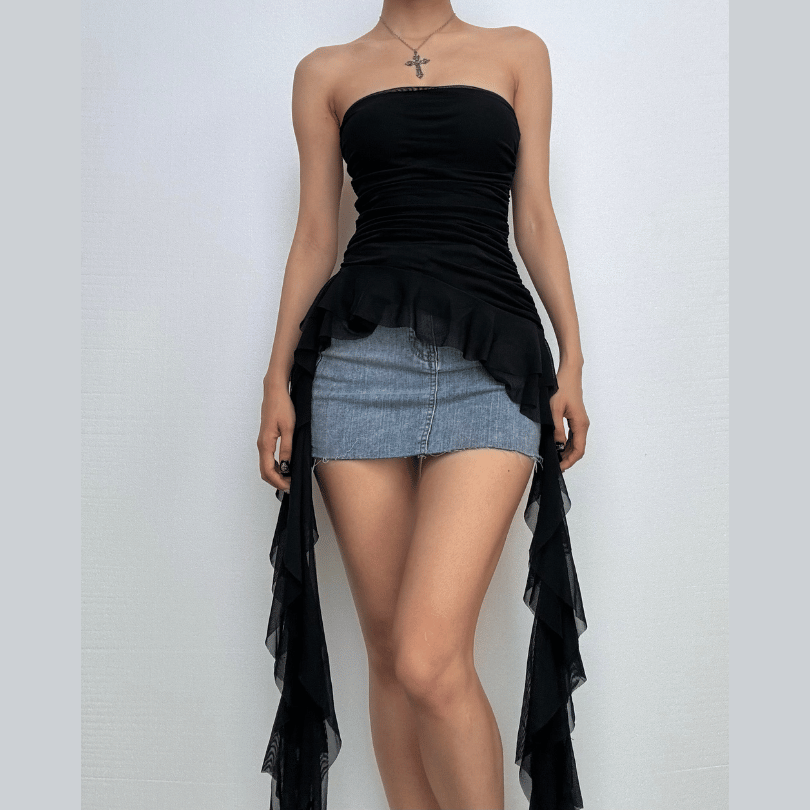 Ruffle mesh ruched irregular solid tube top | Festival Outfits Women