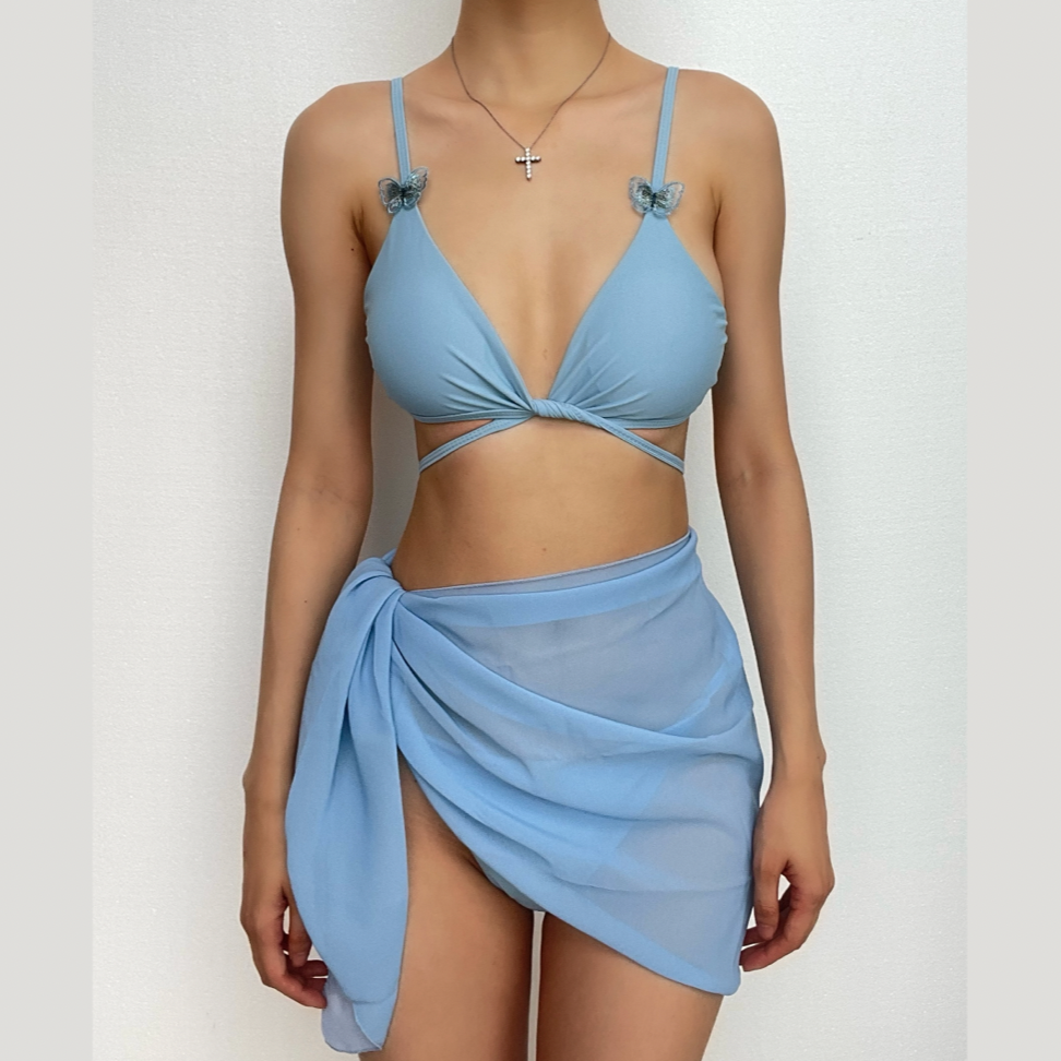 Solid self tie irregular butterfly applique 3 piece swimwear