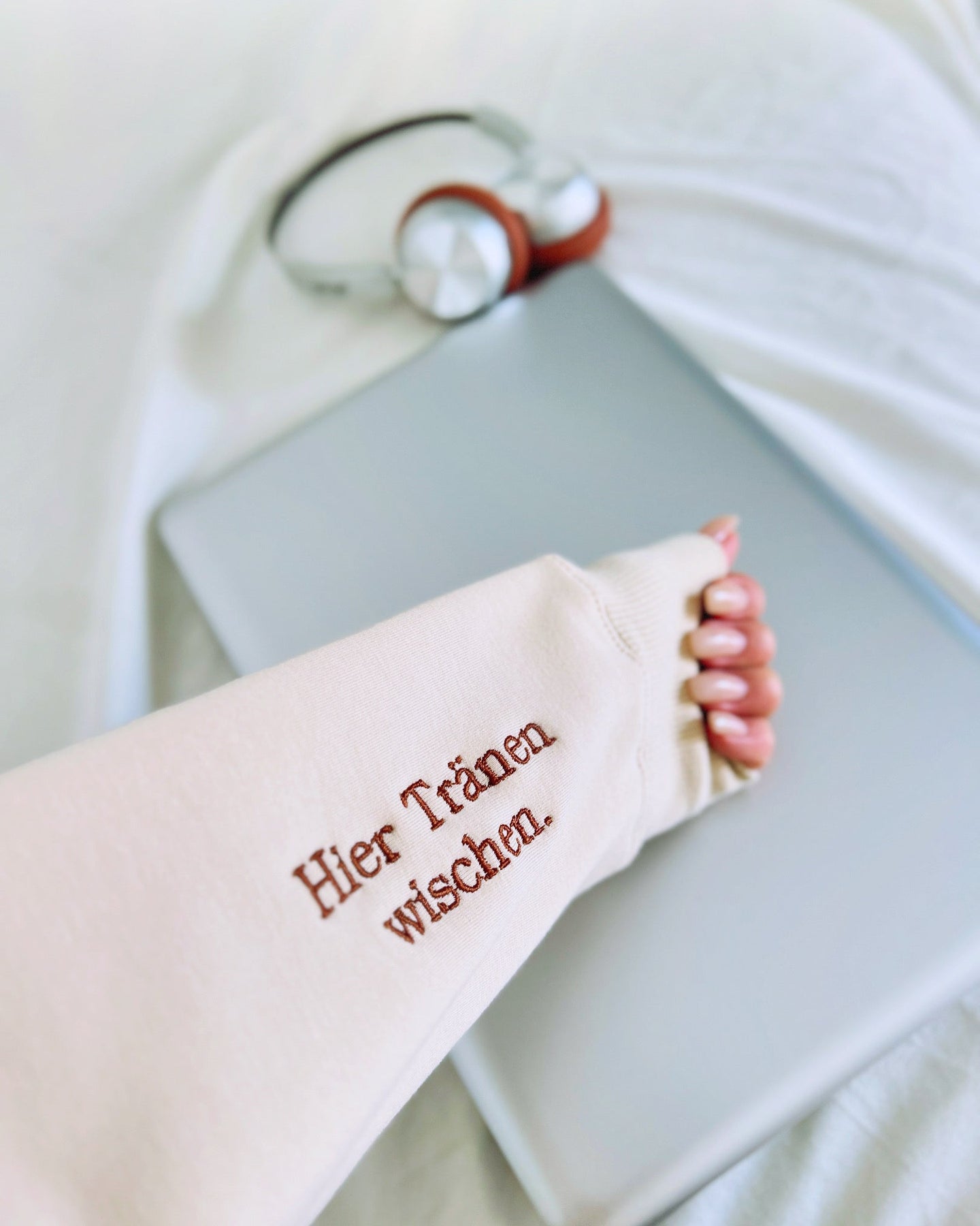 "Hier Tränen wischen." auf den inneren Handgelenken bestickt