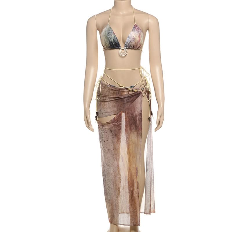 Halter contrast self tie 3 piece bikini swimwear